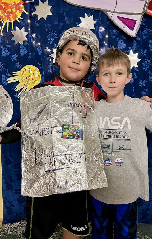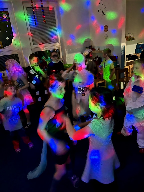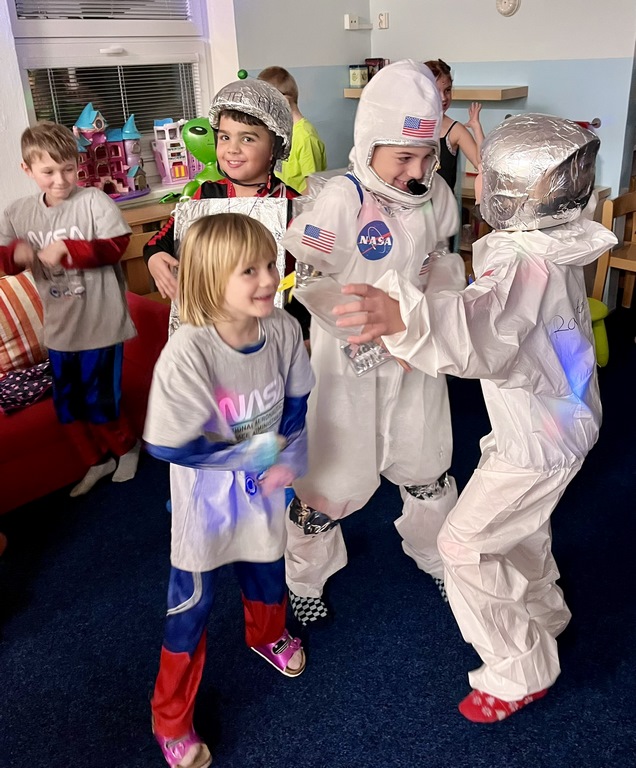 Galaktická paráda u nás v družině proběhla za účasti komet, astronautů, návštěvníků z cizích galaxií, dorazilo dokonce i několik pracovníků z NASA a nechyběl ani hvězdný prach. Uklidili jsme si v Mléčné dráze, proběhli po planetách, vyzkoušeli jsme si i chůzi v botách astronautů. Jako specialita večera se podával mléčný koktejl a na posilnění nám maminky připravily nesmírně vesmírné dobroty. Hlásíme, že mise byla úspěšně splněna!